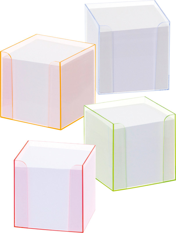 Boîte à fiches FOLIA transparente Luxbox en PS, avec env. 800 feuilles blanches. Dimensions: L 95 x H 95 x P 95 mm. 4 couleurs assorties