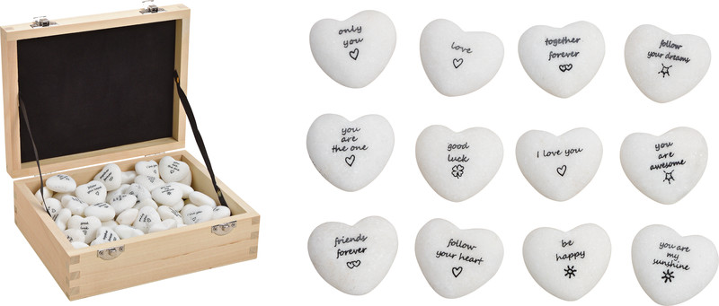Coeur en marbre avec slogan en marbe, blanc, texte en anglais, 12 texte assortis, idéal comme cadeau ou décoration de table avec offret en bois. Dimensions: L 30 x H 30 x P 15 mm. Boîte de 72 pièces.