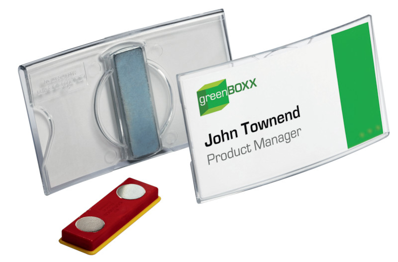 Badges en acrylique DURABLE Konvex avec aimant la forme convexe du badge maintient naturellement le bristol en place, sans cadre, surface transparente, avec aimant assurant une bonne fixation du badge sans abîmer les textiles les plus fragiles, inscription facile et personnalisable gratuitement à l’aide des modèles téléchargeables sur www.duraprint.fr. Attention: les aimants des badges peuvent être incompatibles avec les stimulateurs cardiaques. Boîte de 25 pièces. 75 x 40 mm