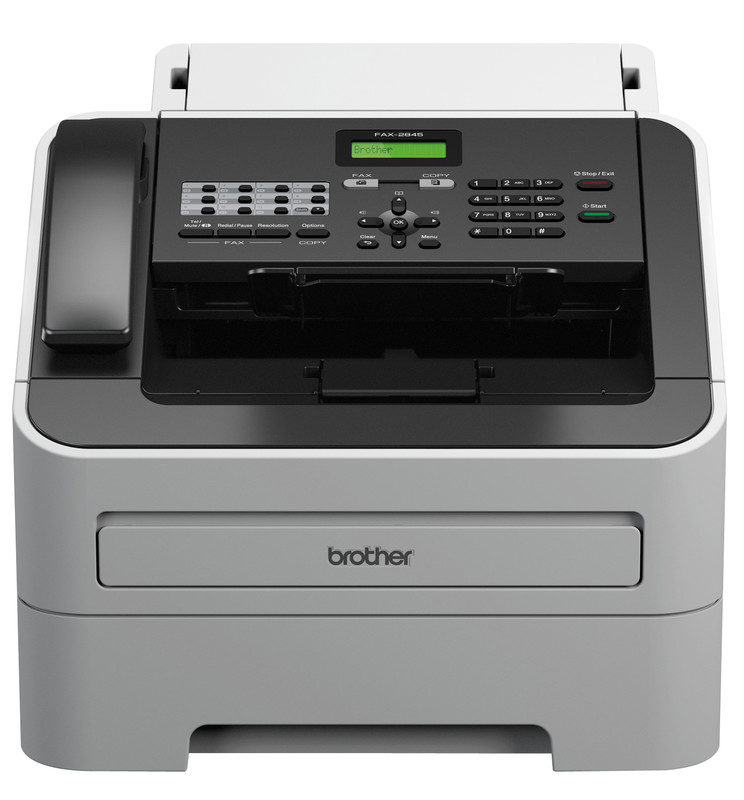 BROTHER Laserfax 2845 Laserfax mit Kopierfunktion und integriertem Hand-Telefon, Übertragungsgeschwindigkeit 33,6 Kbit/s, 22 Zielwahl- und 200 Kurzwahlspeicher, Sende- und Empfangsspeicher bis 400 Seiten, Rundsenden bis 272 Empfänger, Gruppenwahl bis zu 20 Gruppen, Papierkassette für 250 Blatt, Vorlageneinzug für 20 Blatt. Kopierer: Kopiergeschwindigkeit bis 20 Seiten/Min., Zoom 25 – 400%, bis 99 Mehrfachkopien. Masse: B 368 x H 311 x T 360 mm. Gewicht: 8,8 kg. Preis inkl. VRG. Zertifikat: Der Blaue Engel, Energy Star.