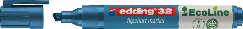 EDDING® Flipchart Marker 32 EcoLine Keilspitze, Clip, speziell geeignet zur Anwendung auf Papier, Tusche schlägt nicht durchs Papier, geruchsneutrale, wassergelöste Tusche, cap-off-Tusche – einige Wochen offen lagerfähig ohne einzutrocknen, Kunststoffteile aus 90% recyceltem Material (83% post-consumer), nicht nachfüllbar, Strichbreite ca. 1,5 – 5 mm. blau