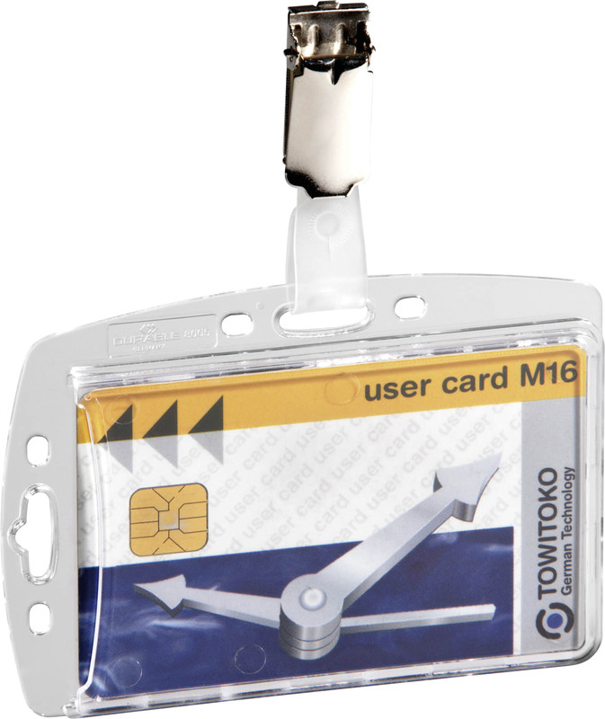 DURABLE Hartboxen für Betriebsausweise kristallklar, schützt und schafft durch die Daumenstanzung einen schnellen Zugriff, im Hoch- und Querformat nutzbar. Innenmasse: B 87 x H 54 mm. mit Clip Packung zu 25 Stück. für 1 Betriebsausweis
