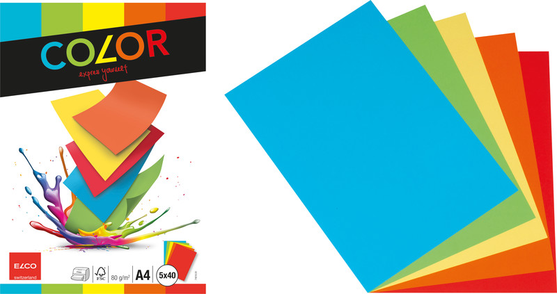 ELCO Universalpapier Color Format A4, 80 g/m2. Geeignet für Kopierer, Laser-/ Inkjetdrucker und Farblaserdrucker/ -kopierer. Zertifikat: FSC. farbig sortiert 5 Farben, je 40 Blatt intensivrot, orange, intensivgelb, intensivgrün und intensivblau. Packung zu 200 Blatt.