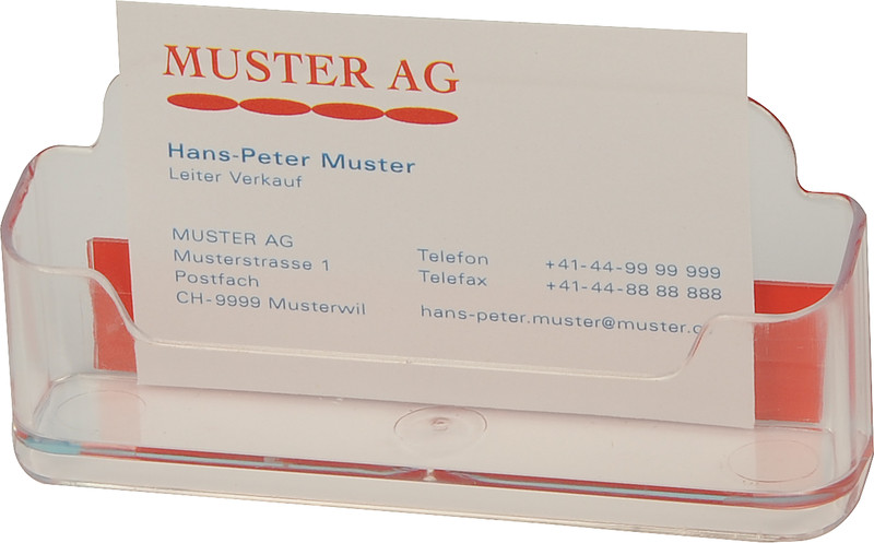 BoOffice Visitenkartenständer selbstklebend aus umweltfreundliche PS, für Wandmontage mittels Klebeband. Masse: B 114 x H 46 x T 25 mm. transparent